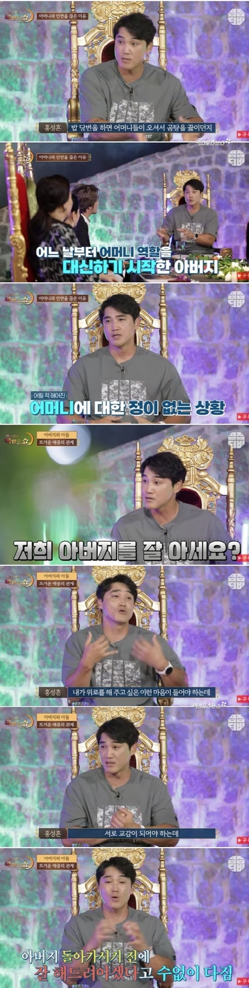 홍성흔은 "중학교 1학년 때 부모님이 이혼을 하셨다. 난 합숙 생활을 많이 하다 보니 이혼하신 줄 몰랐다. 밥 당번을 하면 어머니들이 오셔서 곰탕을 끓어주던가 극을 끓여주던가 로테이션으로 해야 하는데 아버지가 오더라. 엄마가 잠깐 어디 갔다고 하셨다. 밥이 왜 이러냐고 야구부원들의 불만이 쏟아졌다. 집안이 어려워지기 시작한 거다. 엄마가 낳아주신건 감사한데 지금 정이란 건 없다. 엄마에게는 기억이 없고 추억도 없다"라고 털어놓았다.