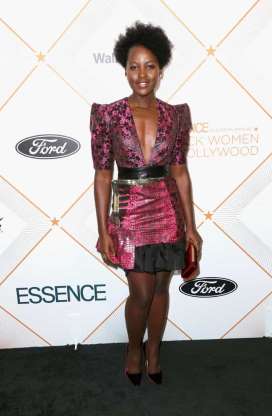 꽃무늬와 뱀피, 러플 장식, 줄무늬 패턴까지 복잡한 의상을 착용한 루피타 뇽. 다음번에는 조금 더 신경 써주세요!